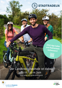 Der diesjährige Stadtradeln-Aktionszeitraum des Landkreises Diepholz findet vom 13.05.2026 – 02.06.2026 statt. Ziel der Initiative ist es, in diesem Zeitraum möglichst viele Kilometer mit dem Rad zurückzulegen – mit der Absicht, das Fahrrad als Verkehrsmittel für alltägliche Wege zu etablieren sowie den Spaß an der Bewegung zu entdecken. Ganz nebenbei wird dabei noch etwas Gutes für das Klima und die eigene Gesundheit getan!